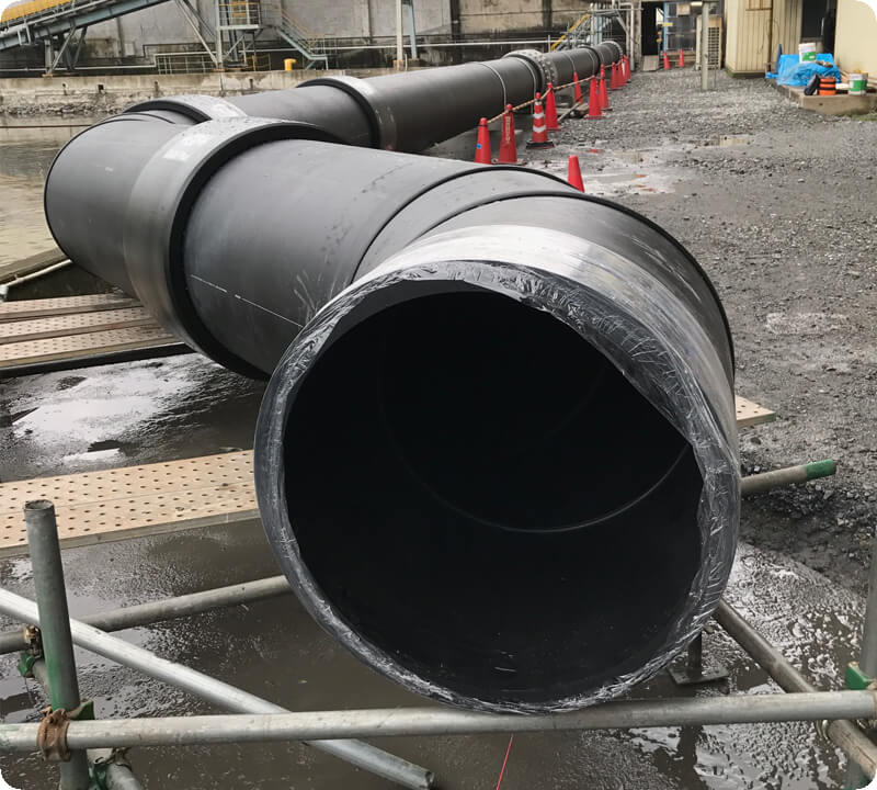 圧力用高密度ポリエチレンパイプは、優れた耐震性・耐食性を持ち、工業用水や上水、海水のほか、薬品の工場設備配管にも対応可能。軽量で施工性が良く、長期使用に適した高耐久仕様です。また、融着接合による一体構造管路により、漏水リスクのない配管材料です。