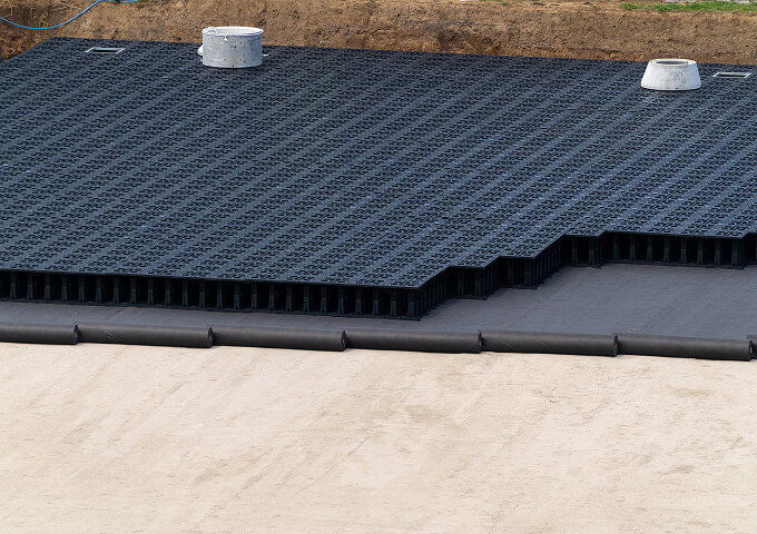 河川の氾濫や都市型水害が増加している為、雨水流出抑制が必要となっています。雨水貯留槽では、商業施設や工場、物流倉庫等の駐車場、公園や広場の地下に埋設する為、地表面は有効利用が可能です。